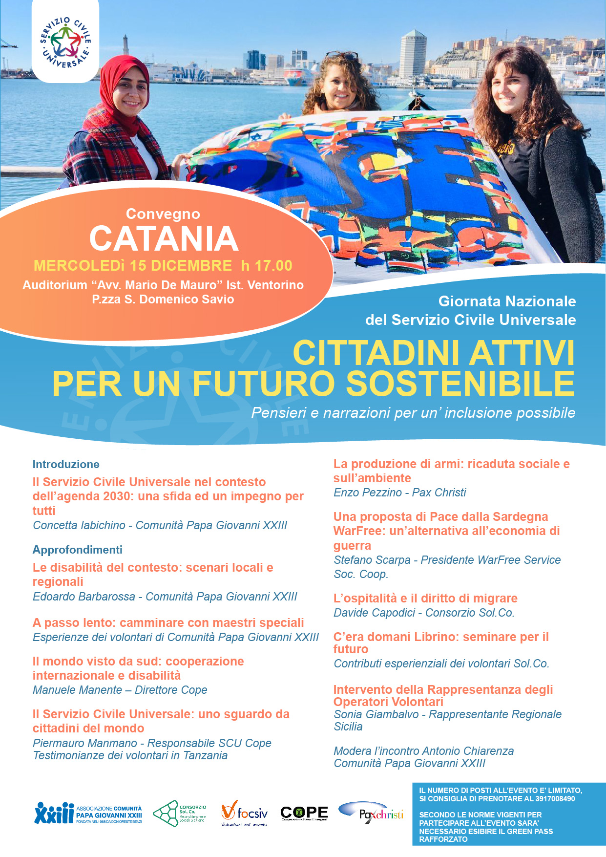 In occasione della Giornata Nazionale del Servizio Civile Universale, il prossimo MERCOLEDì 15 DICEMBRE alle ore 17.00, presso l’Auditorium “Avv. Mario De Mauro” Ist. Ventorino in P.zza S. Domenico Savio di Catania, avrà luogo il convegno “Cittadini Attivi per un futuro sostenibile – Pensieri e narrazioni per un’inclusione possibile”