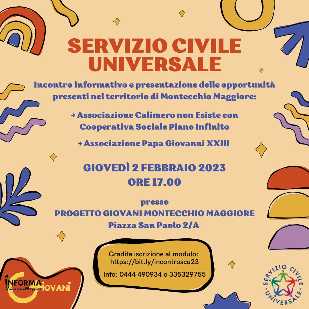 Si terranno mercoledì 1 febbraio alle ore 17.30 presso CASA PER LA PACE in via Porto Godi, 2 a Vicenza e giovedì 2 febbraio alle ore 17.00 presso PROGETTO GIOVANI in Piazza San Paolo 2/A a Montecchio Maggiore (VI) due incontri sul Servizio Civile organizzati rispettivamente da Comunità Papa Giovanni XXIII, Caritas Vicentina, Coop. Soc. Città Solidale e Informagiovani di Montecchio Maggiore.