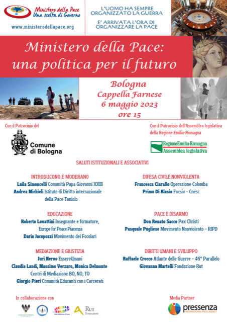 Le associazioni promotrici della Campagna Ministero della Pace – Una Scelta di Governo realizzeranno il prossimo 6 maggio 2023, presso la Sala Cappella Farnese di Bologna l’evento “Ministero della Pace: una politica per il futuro”, con inizio alle ore 15.00. L’evento viene realizzato con il patrocinio dell’Assemblea Legislativa della Regione Emilia Romagna e del Comune di Bologna. Una politica per il futuro concepita come «architettura e artigianato della pace», come dichiara Papa Francesco nell’Enciclica Fratelli Tutti.