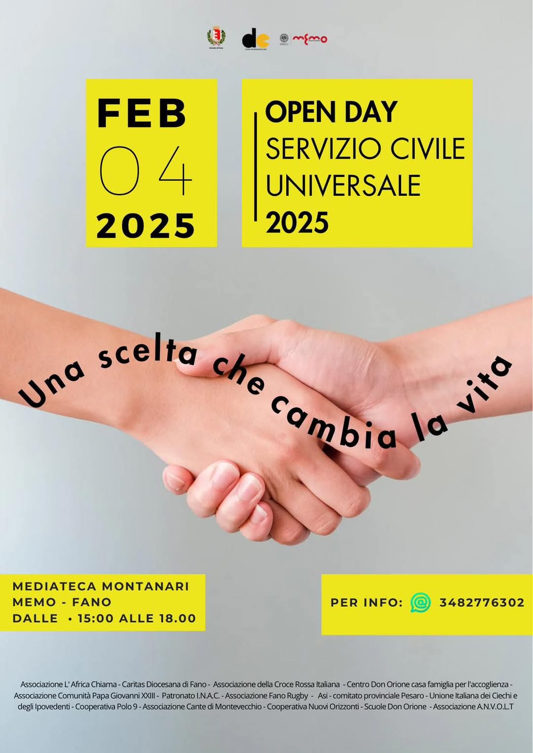 Presso la Mediateca Montanari MeMo, in Piazza Pier Maria Amiani a Fano, il 4 febbraio si terrà un Open Day sul Servizio Civile per permettere a tutti i giovani dai 18 ai 28 anni del territorio di Fano di conoscere i progetti attivi sul territorio fanese e sui comuni limitrofi.
