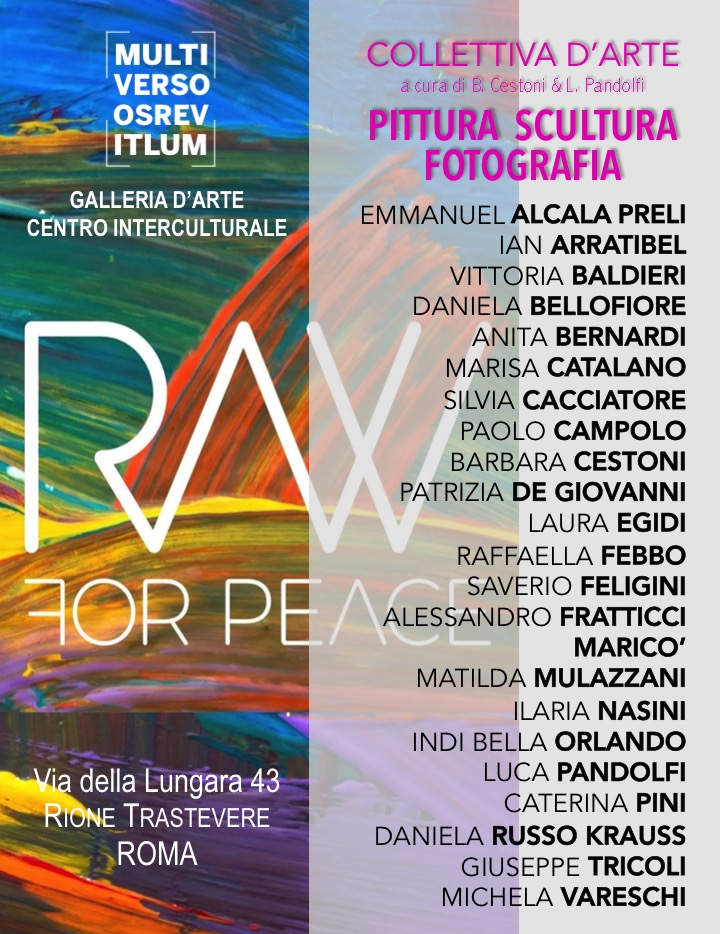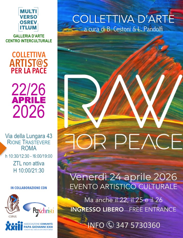 RAW for Peace è una giornata speciale di Rome Art Week dedicata alla pace, al dialogo e alla convivenza attraverso i linguaggi della cultura contemporanea. Dal 22 al 26 aprile presso MULTIVERSO Galleria d’Arte e Centro Interculturale , in Via della Lungara 4 al Rione Trastevere di Roma, più di 25 uomini e donne da tutta Italia esporranno le loro opere di pittura, scultura, fotografia, poesia e musica, animando la città con cinque giorni di eventi culturali e sociali che promuovono la pace, i diritti e l’incontro tra i popoli.