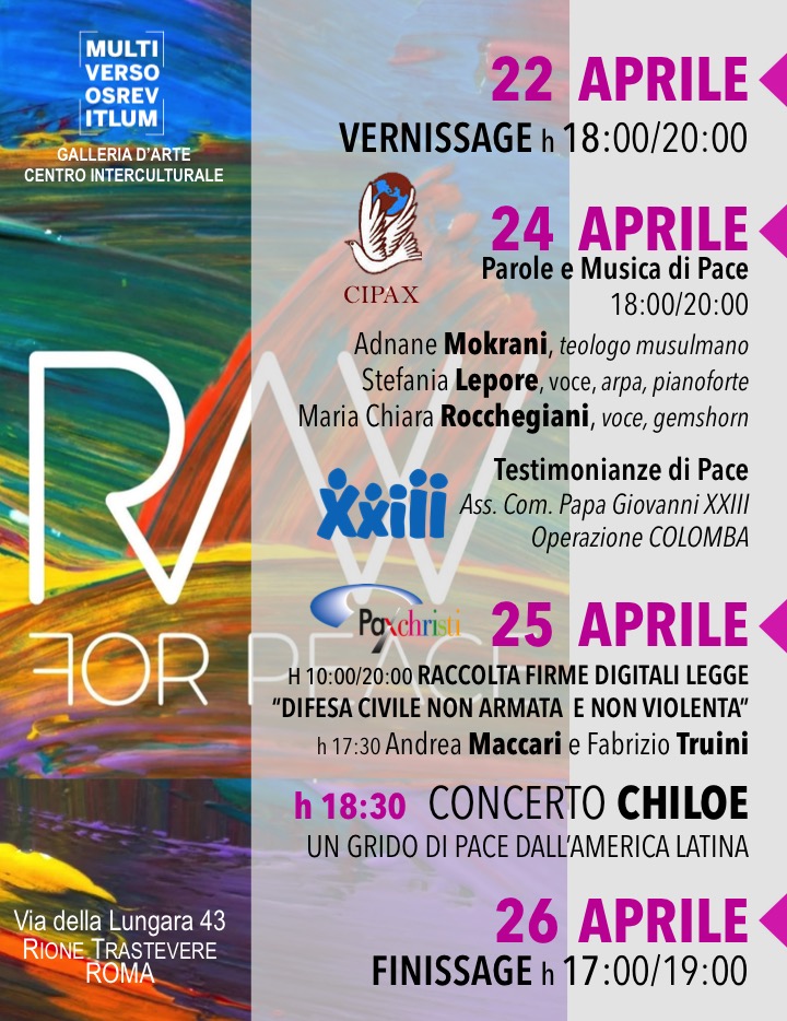 Raw for Peace avrà inizio mercoledì 22 aprile alle ore 18.00 con il Vernissage della Collettiva di pittura, scultura e fotografia. La giornata centrale sarà quella del 24 aprile, dove si concentrano la maggior parte degli eventi, tra i quali segnaliamo dalle ore 17.00 alle 20.00 “RAW for Peace a Multiverso”, con Adnane Mokrani, teologo musulmano, Stefania Lepore, voce arpa e pianoforte, Maria Chiara Roccheggiani, voce, gemshorn, glockenspiel e testimonianze di pace a cura dell’ass. Comunità Papa Giovanni XXIII e il suo Corpo Nonviolento di Pace Operazione Colomba.